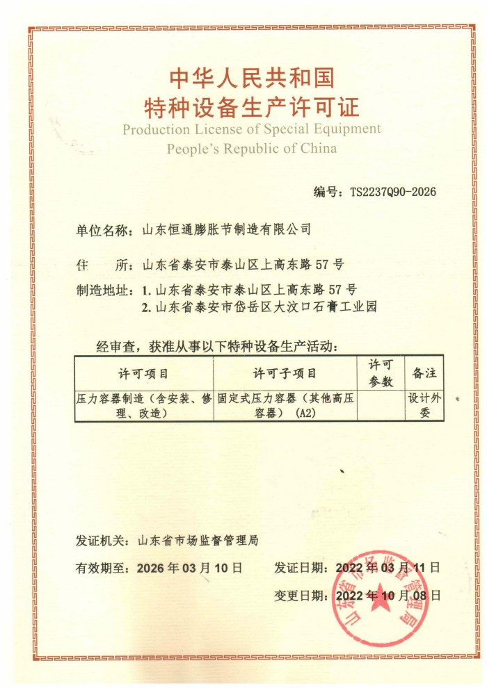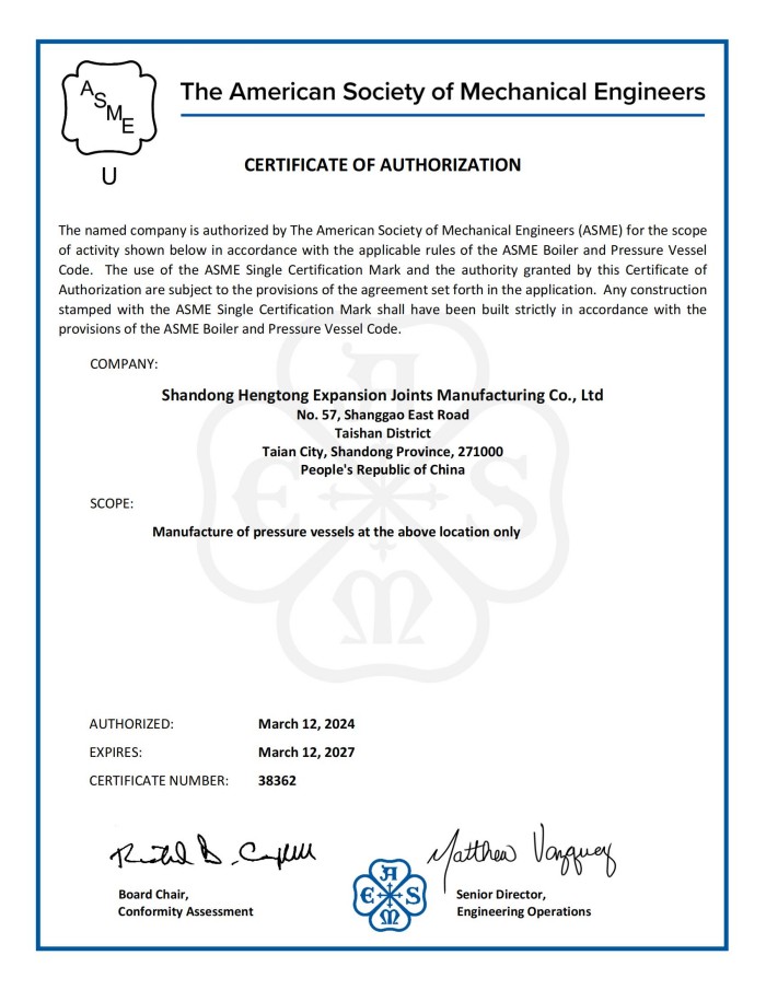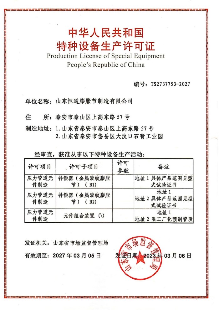 山東恒通膨脹節(jié)制造有限公司是一家集研發(fā)、設計、制造、銷售和服務于一體的大型膨脹節(jié)制造企業。公司取得我國特種設備制造許可證、壓力容器A1級資質、壓力管道元件A、B的資質,并且獲得了歐盟PED-CE認證、美國ASME“U”鋼印、ISO 9000質量管理體系認證、GB/T 14000 環(huán)境管理體系認證及GB/T 45000 職業健康安全體系認證。膨脹節(jié)產品涵蓋壓力管道波紋膨脹節(jié)、壓力容器波形膨脹節(jié)、金屬波紋管、金屬軟管...