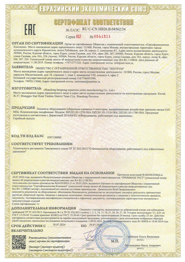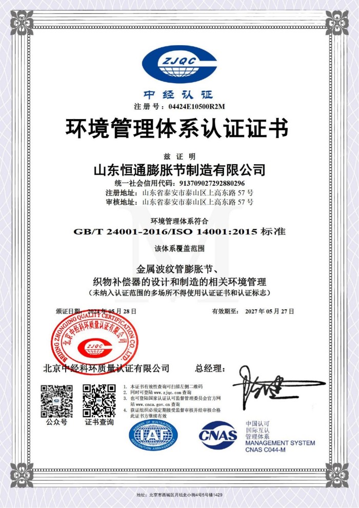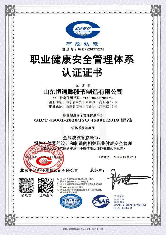 公司取得我國特種設備制造許可證、壓力容器A1級資質、壓力管道元件A、B的資質,并且獲得了歐盟PED-CE認證、美國ASME“U”鋼印、ISO 9000質量管理體系認證、GB/T 14000 環(huán)境管理體系認證及GB/T 45000 職業健康安全體系認證。膨脹節(jié)產品涵蓋壓力管道波紋膨脹節(jié)、壓力容器波形膨脹節(jié)、金屬波紋管、金屬軟管、聚四氟補償器、橡膠補償器及非金屬補償器等。